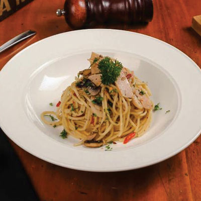 Sauteed Chicken Breast with Lemon Butter Sauce, Mushrooms and Capers Served with Creamy Capellini.