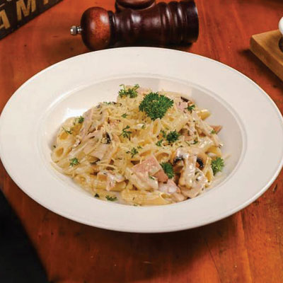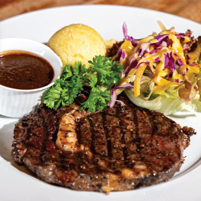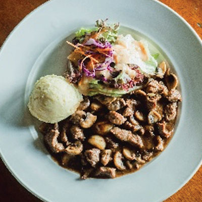 Sautéed sliced beef striploin, mushroom and bell pepper with creamy beef gravy, served with mashed potato.