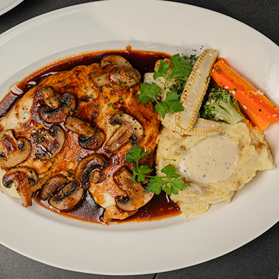 Pan Seared Chicken Breast Topped with and Melted Mozzarella Cheese. Covered with Fresh Mushroom and Bordelaise Sauce and Served with Mashed Potatoes.