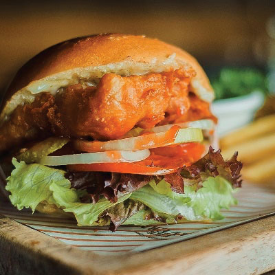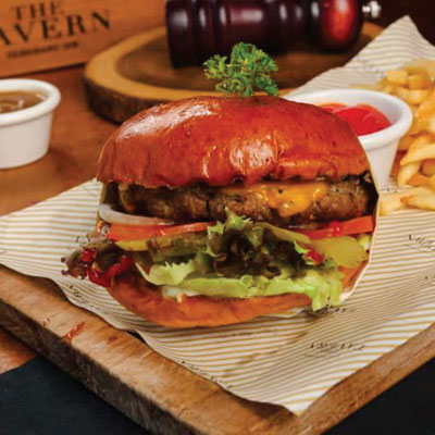 180g grass-fed burger patty, melting cheddar, gherkin, lettuce, tomato, tartar dressing, stack on a brioche bun, served with fries.