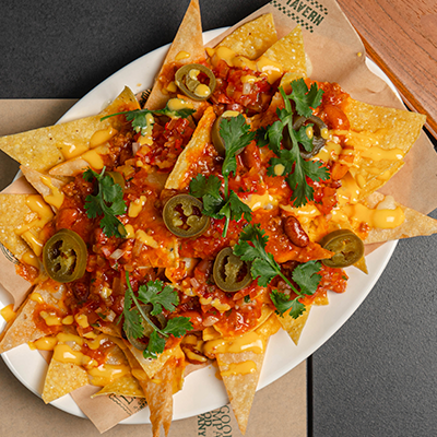 Oven baked Tortilla chips, Red Cheddar, Mozarella, Beef Ragout, Chile Con Queso, Tomato Salsa and Jalapeno