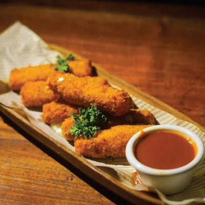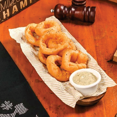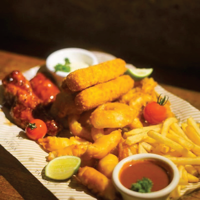 Chicken wings with choices of sauce (Hot Barbecue/Buffalo) Calamari, Fish finger, Mozzarella stick and Onion rings served with tartar sauce, marinara and fries