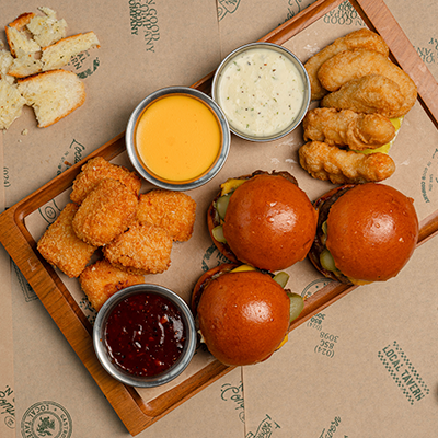Mixed of Cheeseburger Sliders, Buffalo Chicken Shots and Golden Nugget served with Garlic Ranch Dressing, Cheese Sauce, Hot Barbecue Sauce.